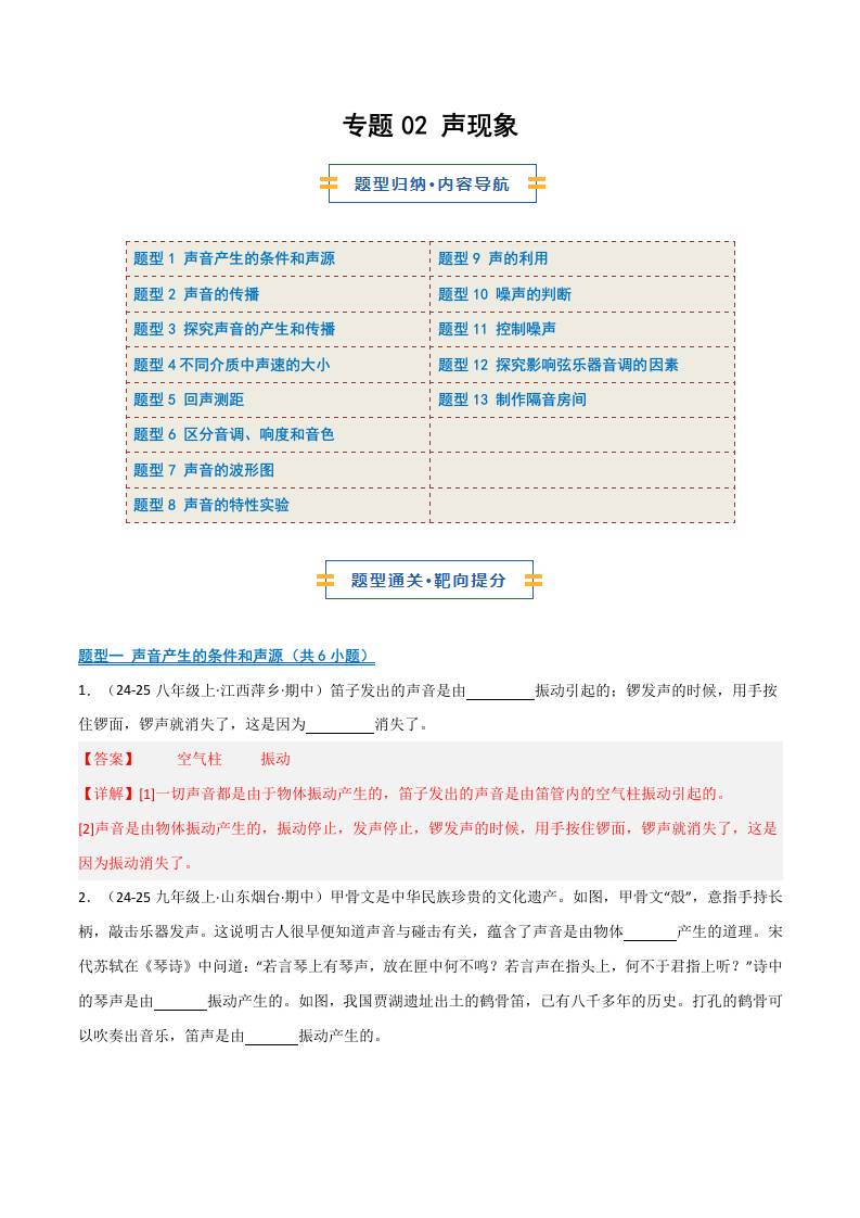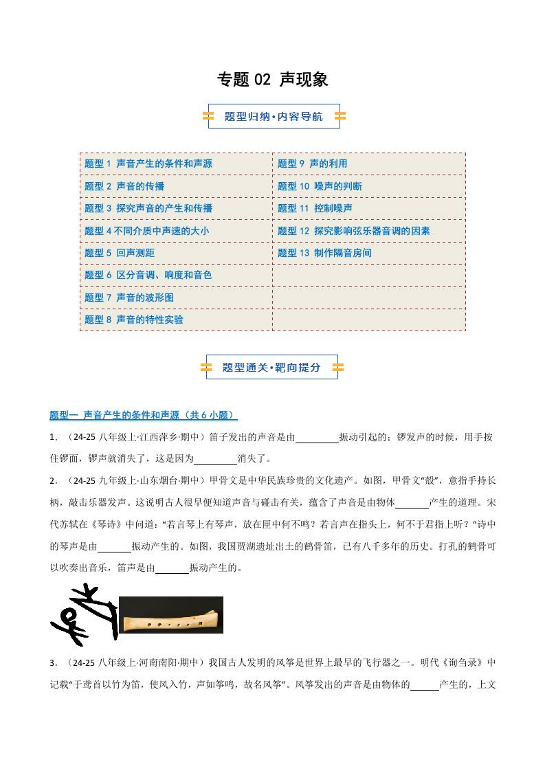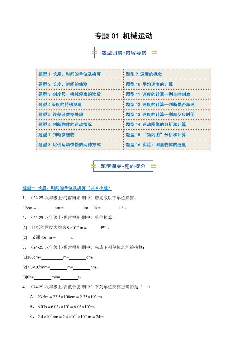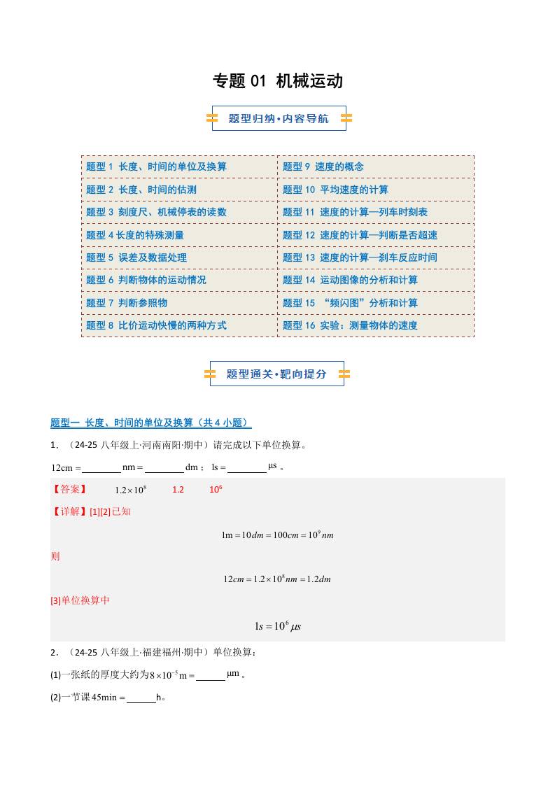 专题01 机械运动 声现象(期中知识清单)(学生版)