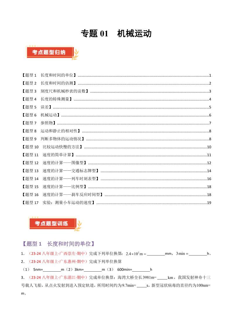 专题01 机械运动【考题猜想】(86题17大类型)(原卷版)