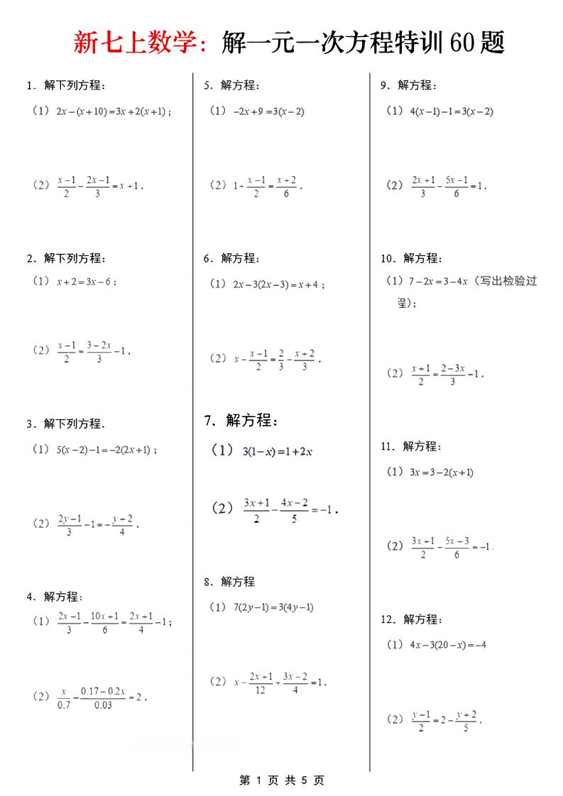 【7.21更新】解一元一次方程特训60道(原卷版)