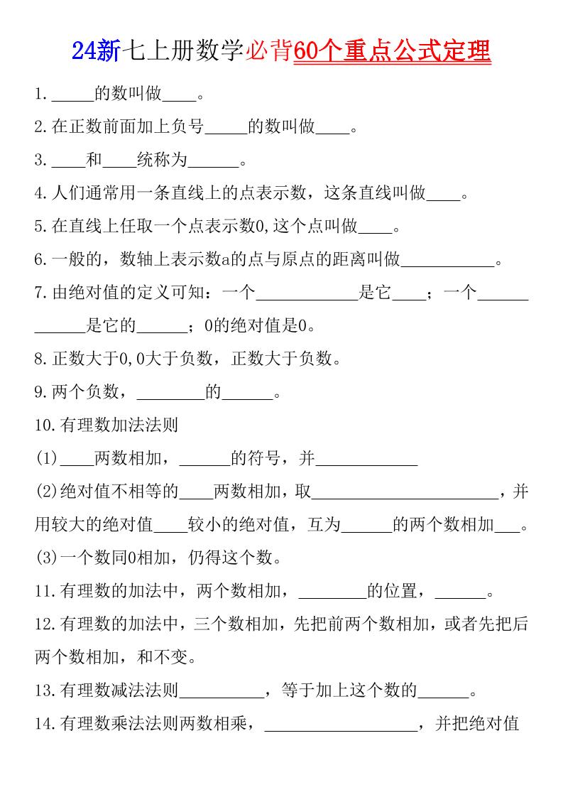 七上数学必背60个重点公式定理(空白版)24新