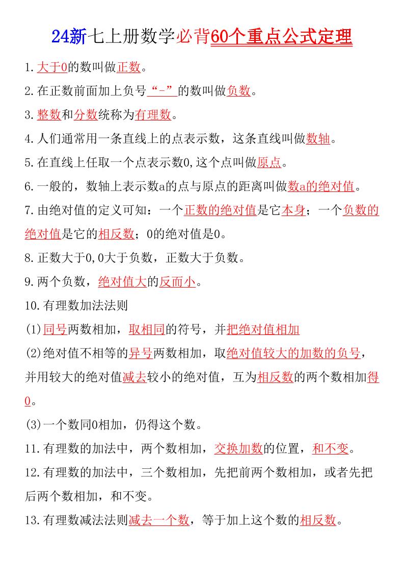 七上数学必背60个重点公式定理(答案版)24新
