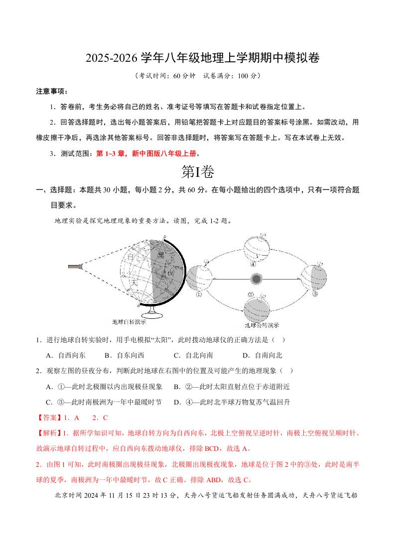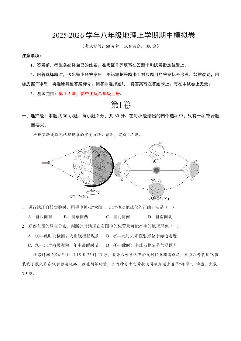 八年级地理上学期期中模拟卷(考试版)【测试范围:新中图版八年级上册,第1~3章】(新中图版)