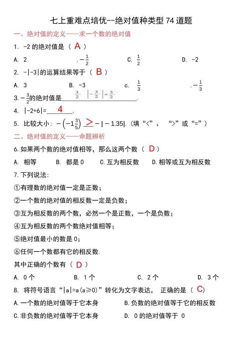 七上数学重难点培优--绝对值种类型74道题(答案)(1)