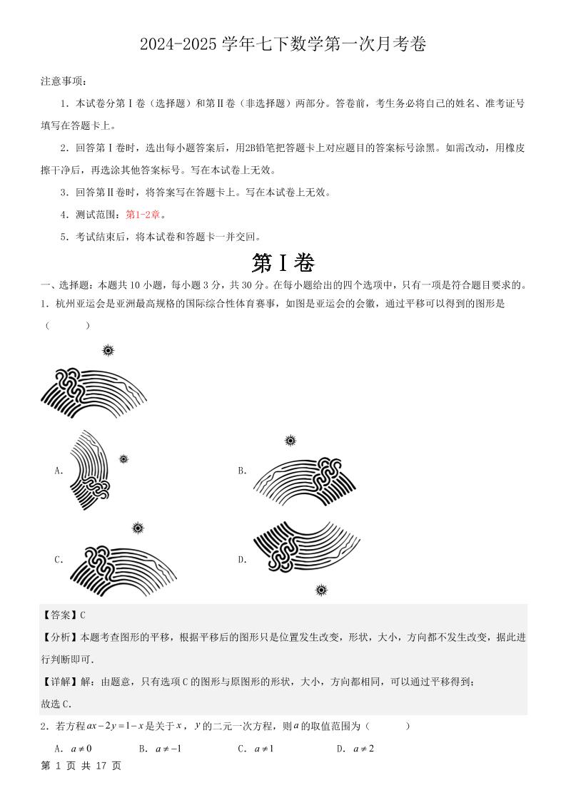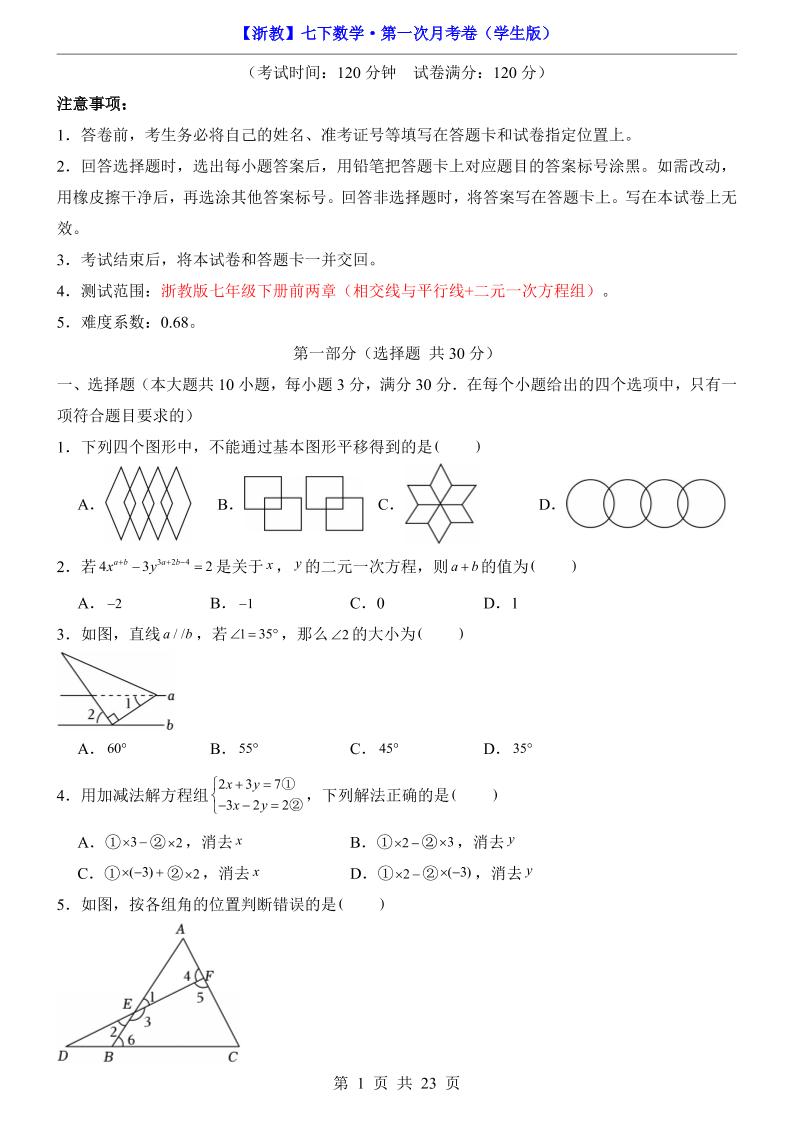 2024-2025学年七下数学第一次月考卷01(解析版)-(浙教版2024新教材)
