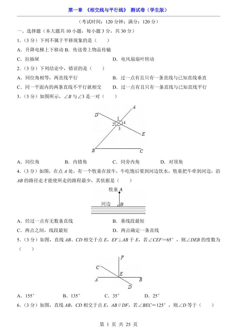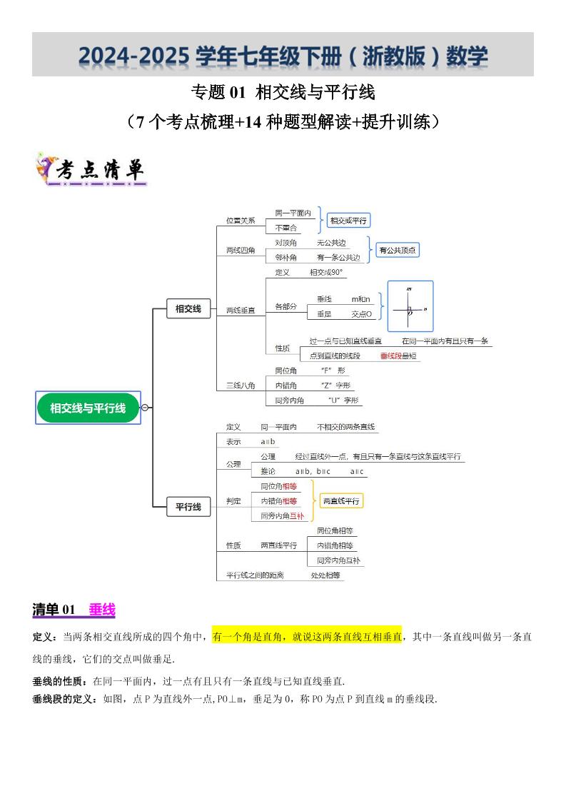 【七下浙教数学】专题01 相交线与平行线(考点清单,7考点14题型)(原卷版)