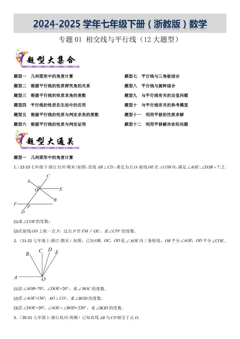 【七下浙教数学】专题01 相交线与平行线(考题猜想,12大题型)(原卷版)