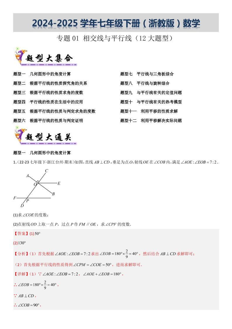 【七下浙教数学】专题01 相交线与平行线(考题猜想,12大题型)(解析版)