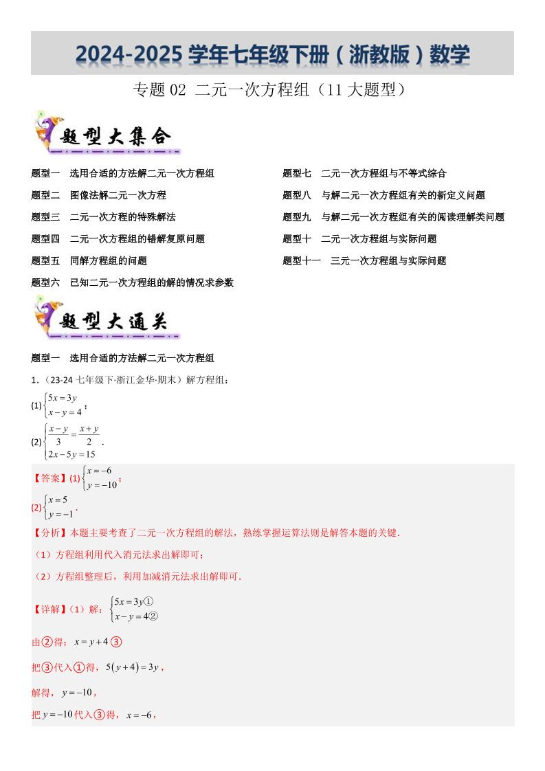 【七下浙教数学】专题02 二元一次方程组(考题猜想,11大题型)(解析版) - 浙7