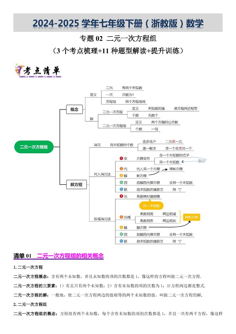 【七下浙教数学】专题02 二元一次方程组(考点清单,3考点11题型)(原卷版)--浙7