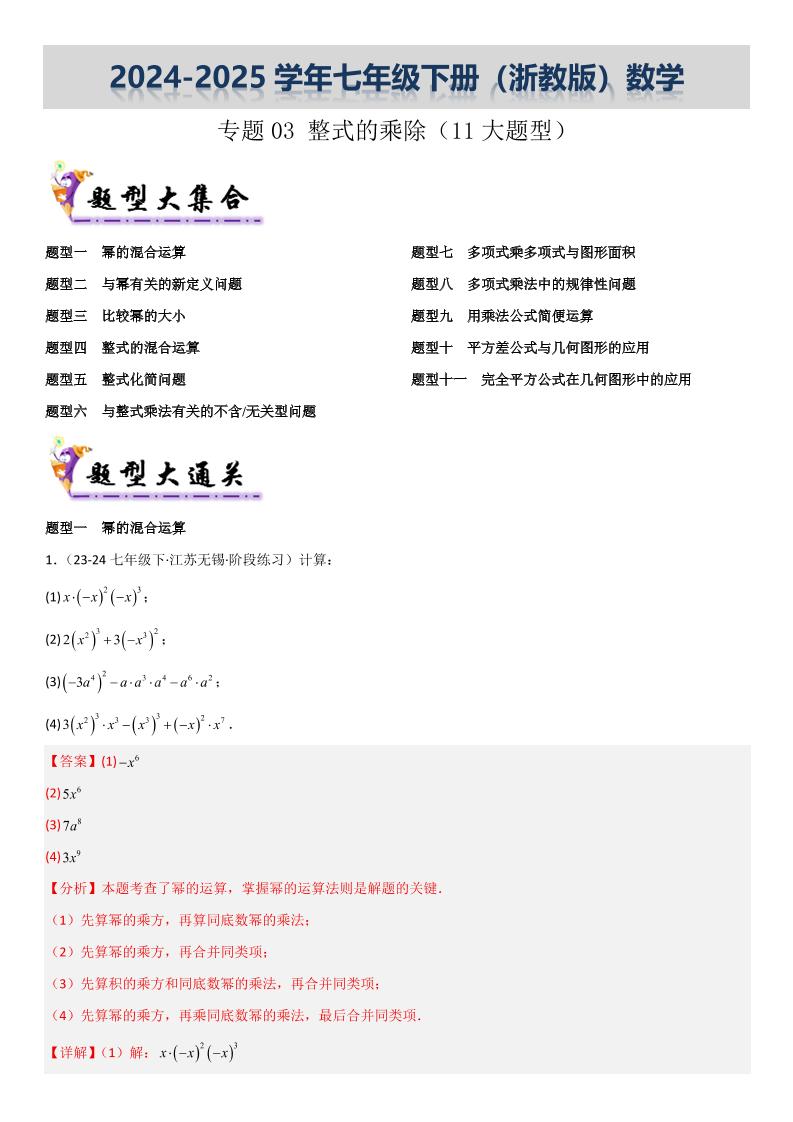 【七下浙教数学】专题03 整式的乘除 (考题猜想,11大题型)(解析版)