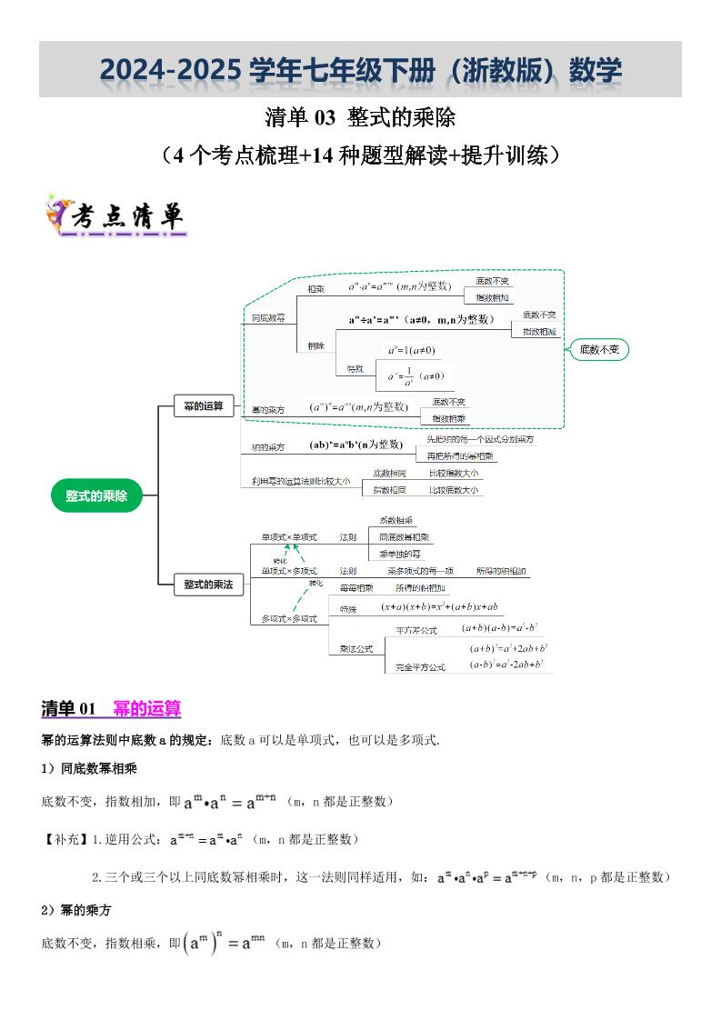 【七下浙教数学】专题03 整式的乘除(考点清单,4考点14题型)(原卷版)