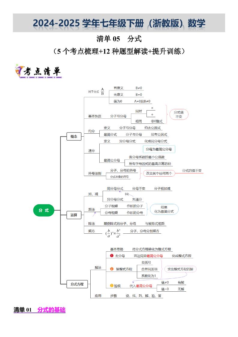 【七下浙教数学】专题05 分式(考点清单,5考点12题型)(原卷版)