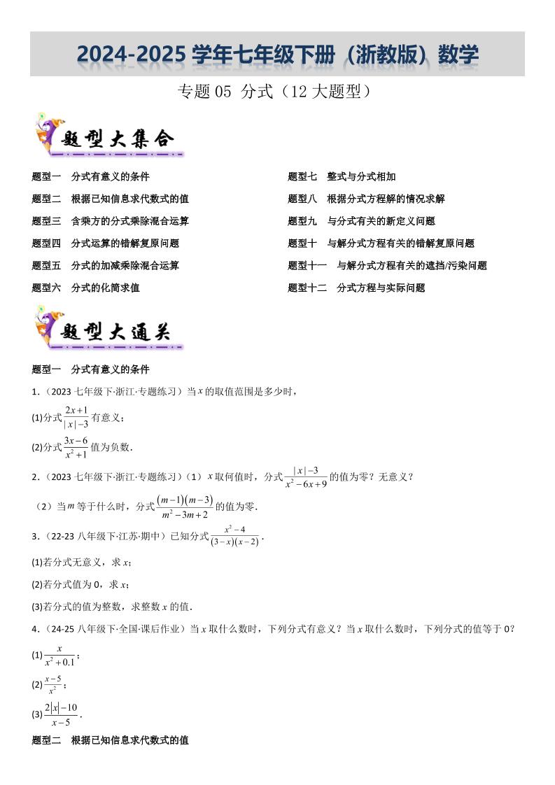 【七下浙教数学】专题05 分式(考题猜想,12大题型)(原卷版)