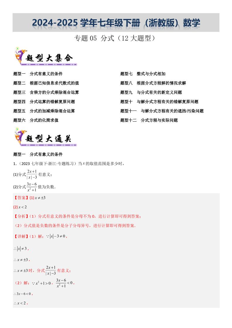 【七下浙教数学】专题05 分式(考题猜想,12大题型)(解析版)