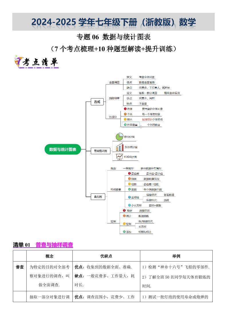 【七下浙教数学】专题06 数据与统计图表(考点清单,7考点10题型)(原卷版)