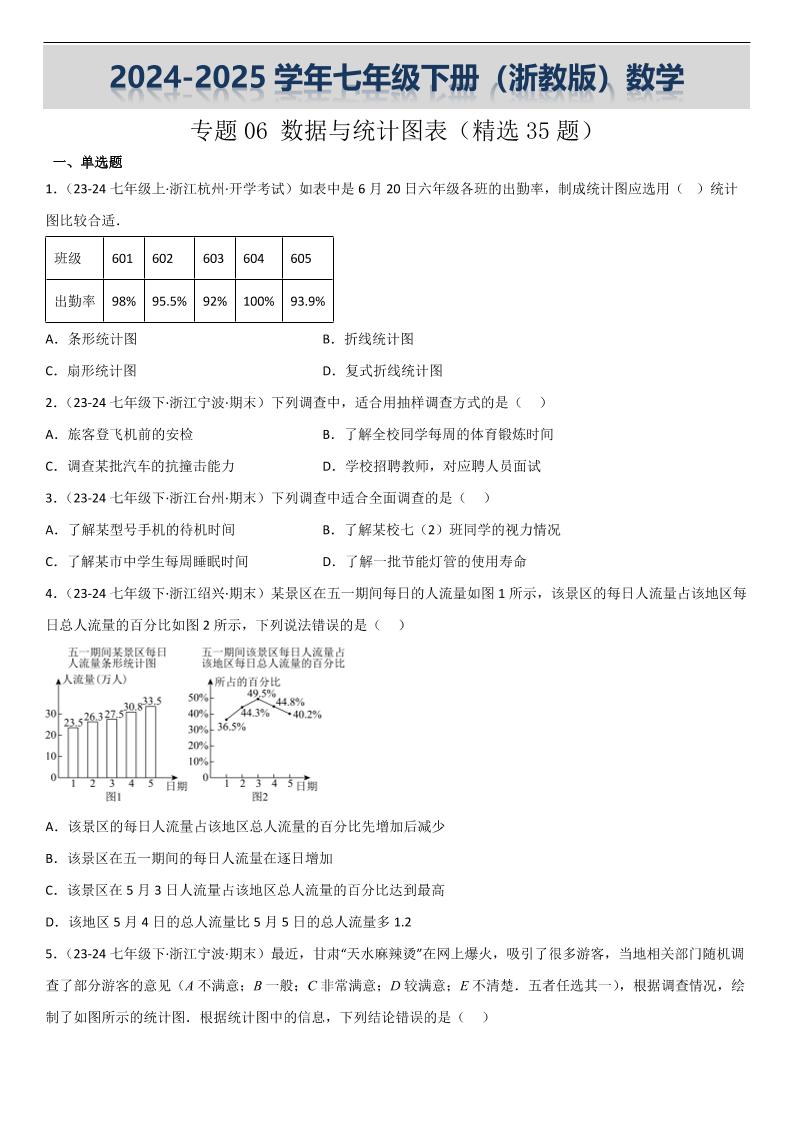 【七下浙教数学】专题06 数据与统计图表(考题猜想,精选35题)(原卷版)
