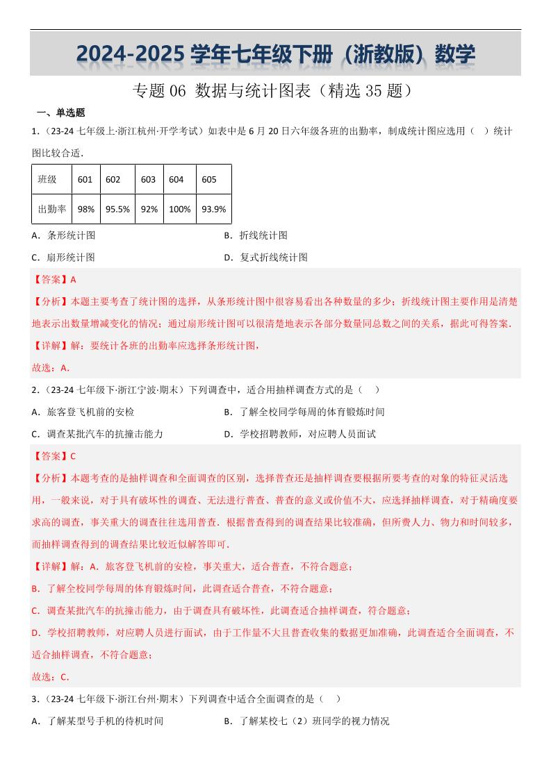 【七下浙教数学】专题06 数据与统计图表(考题猜想,精选35题)(解析版)