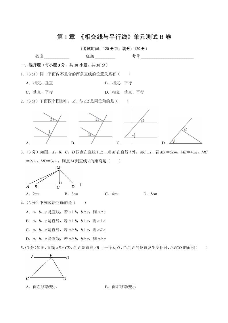 第1章 相交线与平行线(单元测试B卷)(原卷版)