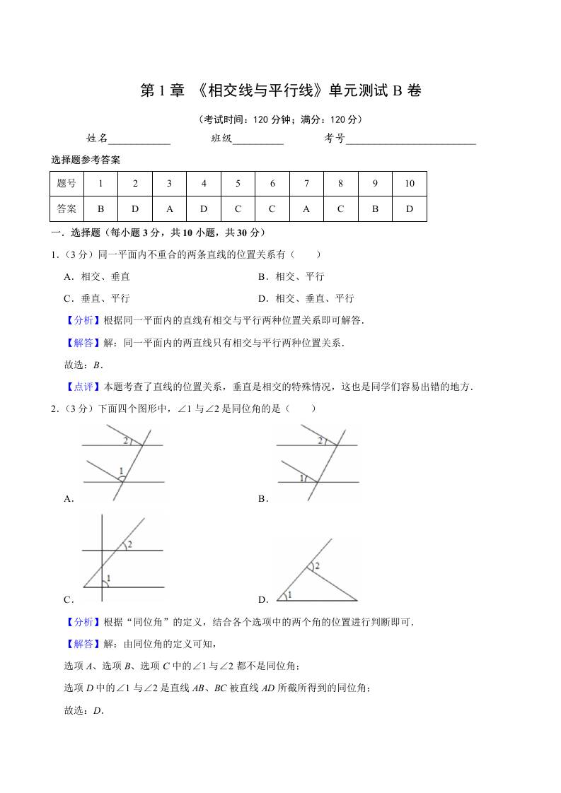 第1章 相交线与平行线(单元测试B卷)(解析版)