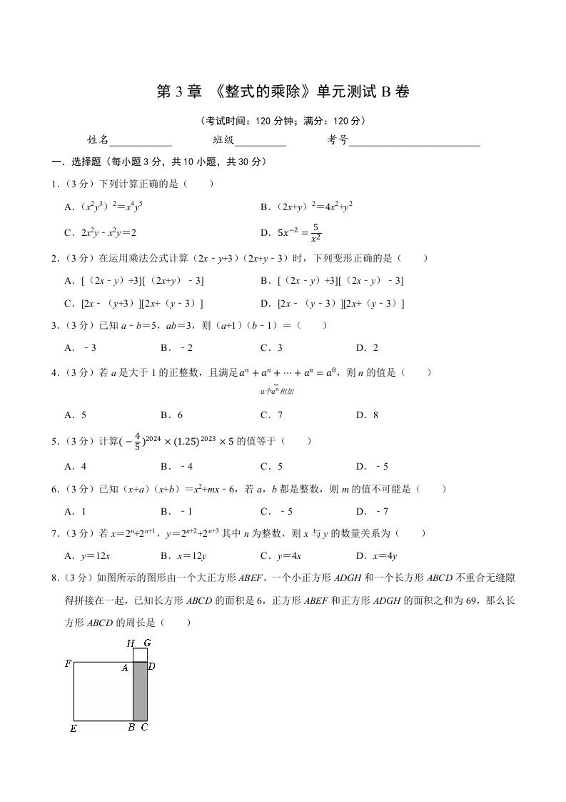 第3章 《整式的乘除》单元测试B卷(原卷版)