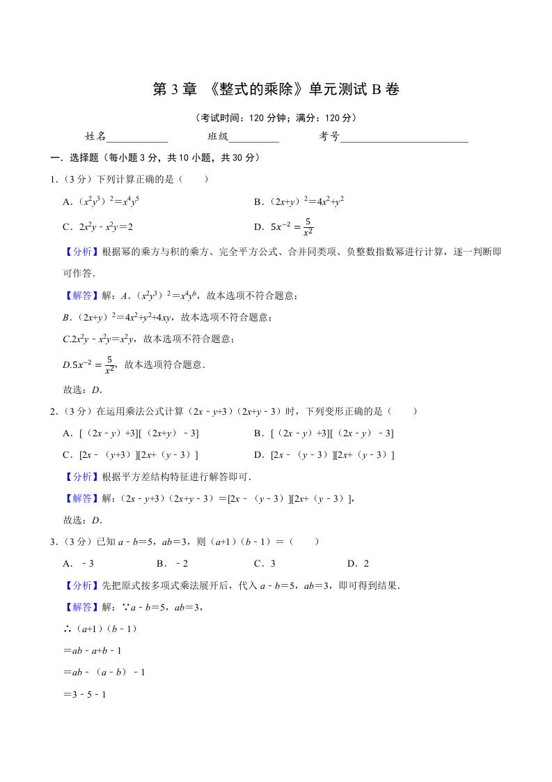 第3章 《整式的乘除》单元测试B卷(解析版)