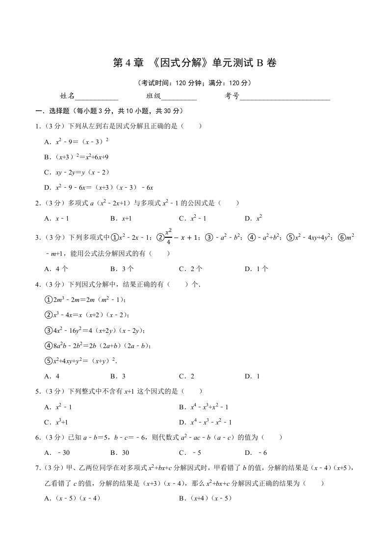 第4章 《因式分解》单元测试B卷(原卷版)