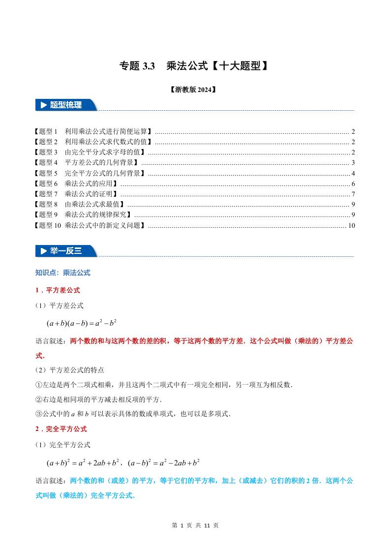 专题3.3 乘法公式【十大题型】(举一反三)(浙教版2024)(原卷版)