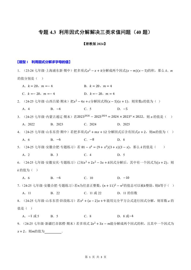 专题4.3 利用因式分解解决三类求值问题(40题)(原卷版)