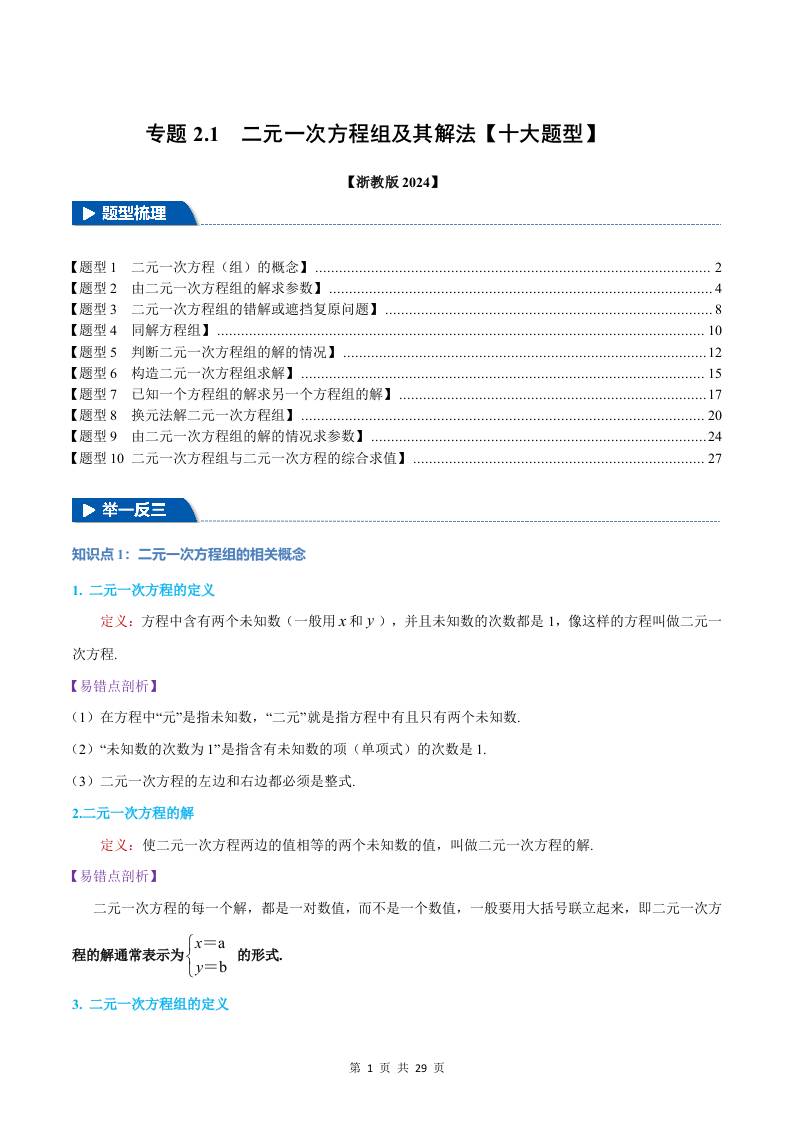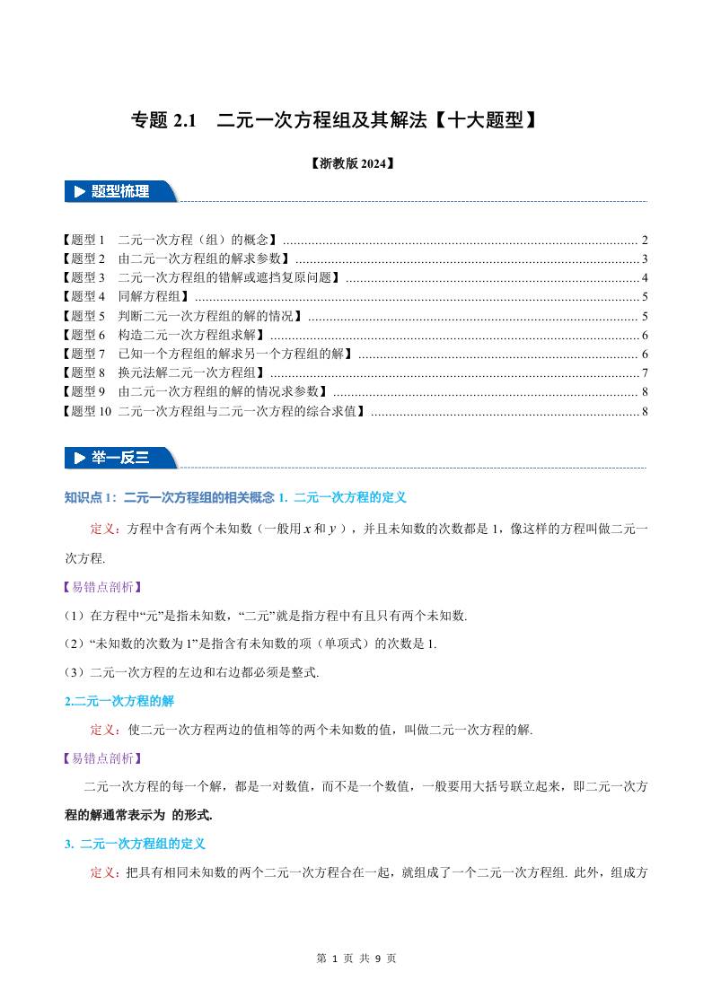 专题2.1 二元一次方程组及其解法【十大题型】(举一反三)(浙教版2024)(解析版)