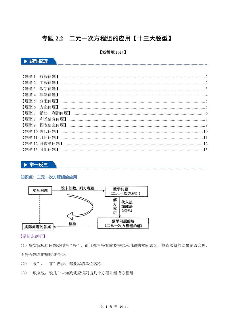 专题2.2 二元一次方程组的应用【十三大题型】(举一反三)(浙教版2024)(原卷版)