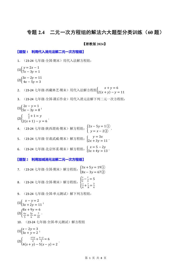 专题2.4 二元一次方程组的解法六大题型分类训练(60题)(浙教版2024)(原卷版)
