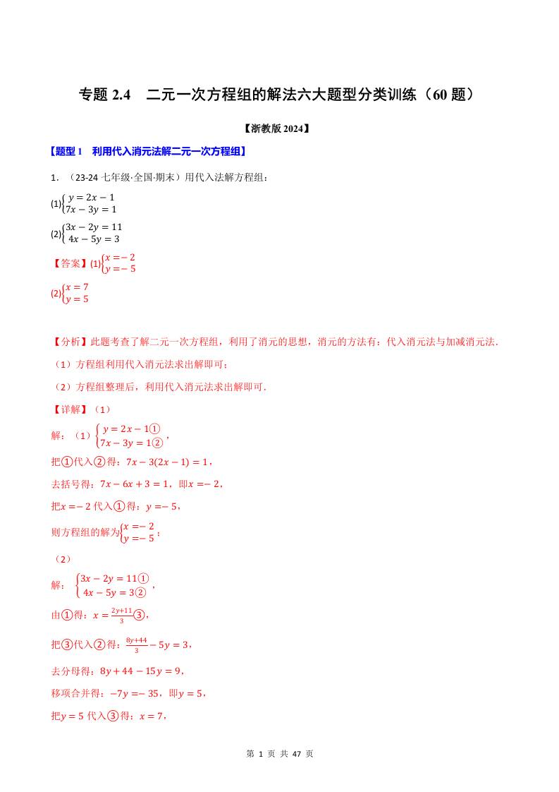 专题2.4 二元一次方程组的解法六大题型分类训练(60题)(浙教版2024)(解析版)