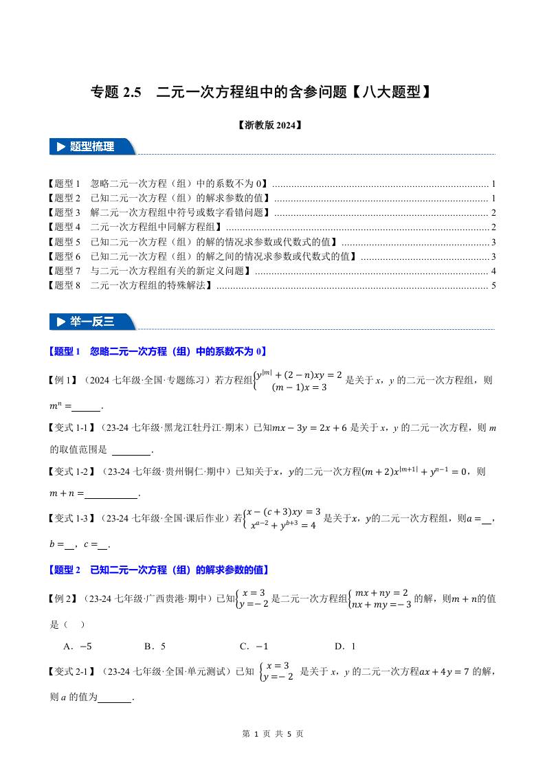 专题2.5 二元一次方程组中的含参问题【八大题型】(举一反三)(浙教版2024)(原卷版)