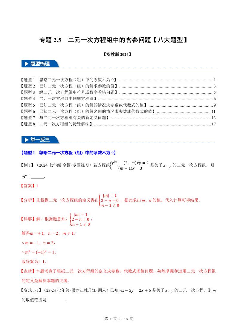 专题2.5 二元一次方程组中的含参问题【八大题型】(举一反三)(浙教版2024)(解析版)