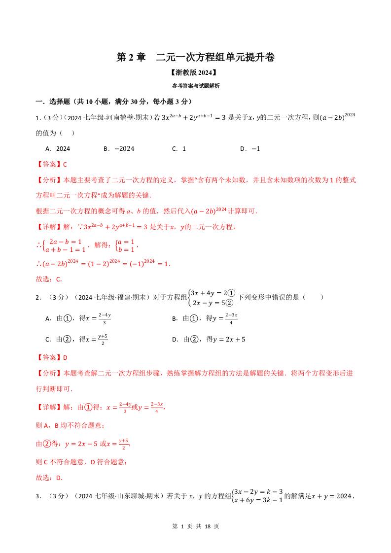 专题2.6 二元一次方程组单元提升卷(浙教版2024)(解析版)