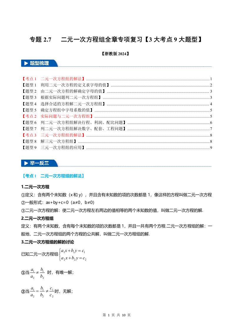 专题2.7 二元一次方程组全章专项复习【3大考点9大题型】(举一反三)(浙教版2024)(原卷版)