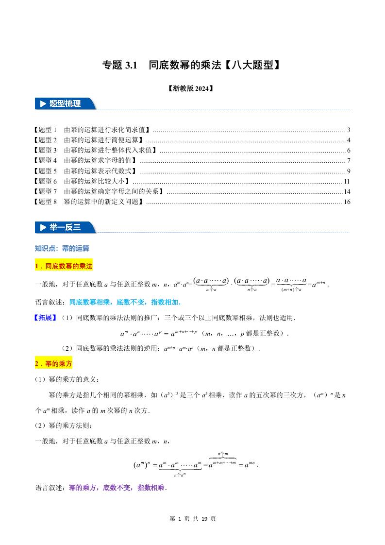 专题3.1 同底数幂的乘法【八大题型】(举一反三)(浙教版2024)(原卷版)