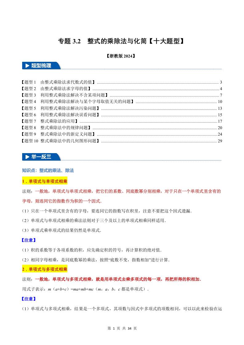 专题3.2 整式的乘除法与化简【十大题型】(举一反三)(浙教版2024)(原卷版)
