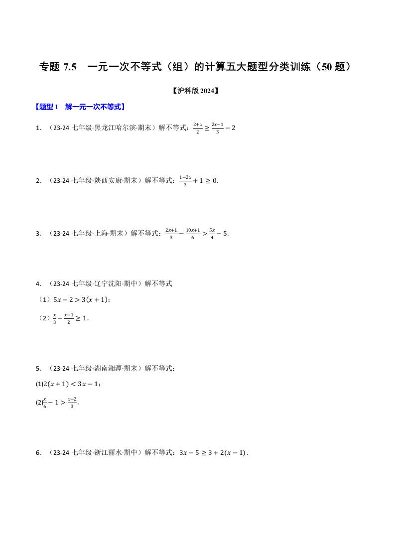 专题7.5 一元一次不等式(组)的计算五大题型分类训练(50题)(沪科版2024)(原卷版)