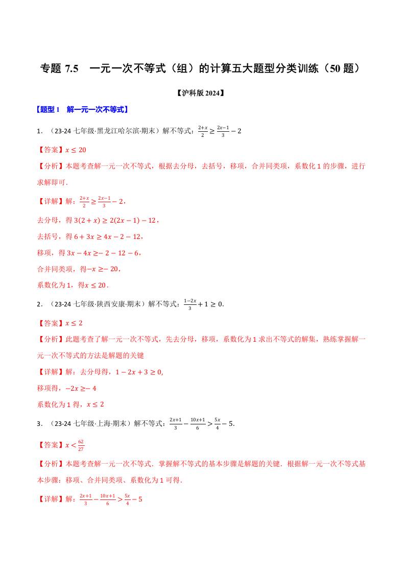 专题7.5 一元一次不等式(组)的计算五大题型分类训练(50题)(沪科版2024)(解析版)