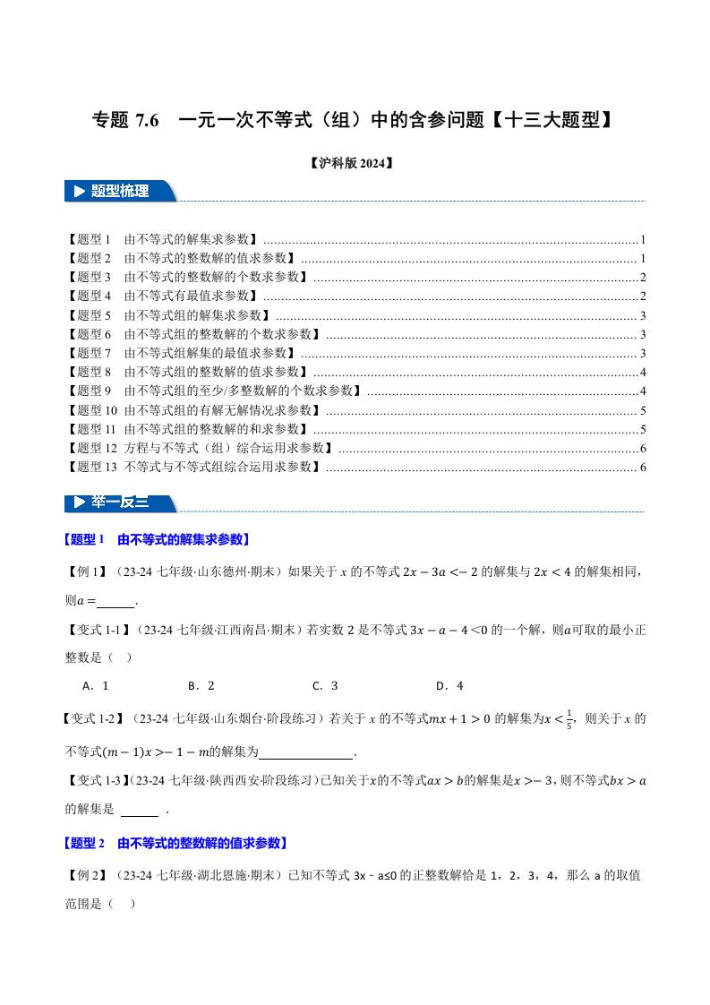 专题7.6 一元一次不等式(组)中的含参问题【十三大题型】(举一反三)(沪科版2024)(原卷版)