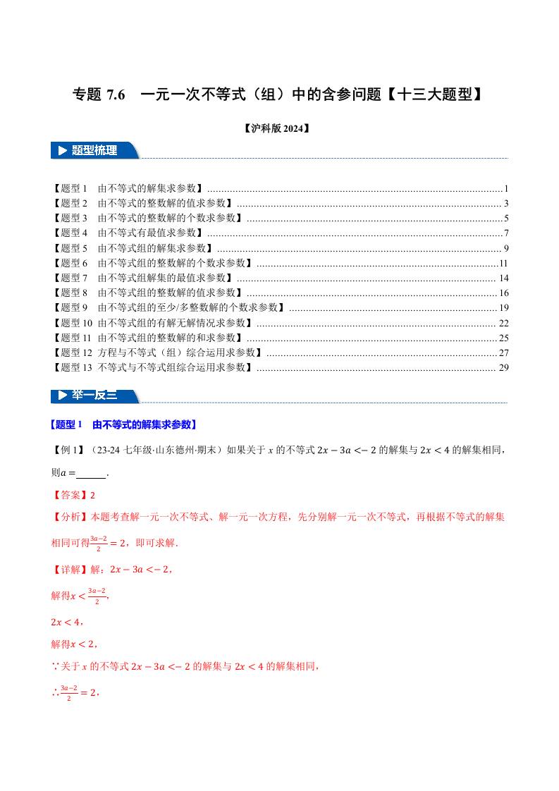 专题7.6 一元一次不等式(组)中的含参问题【十三大题型】(举一反三)(沪科版2024)(解析版)