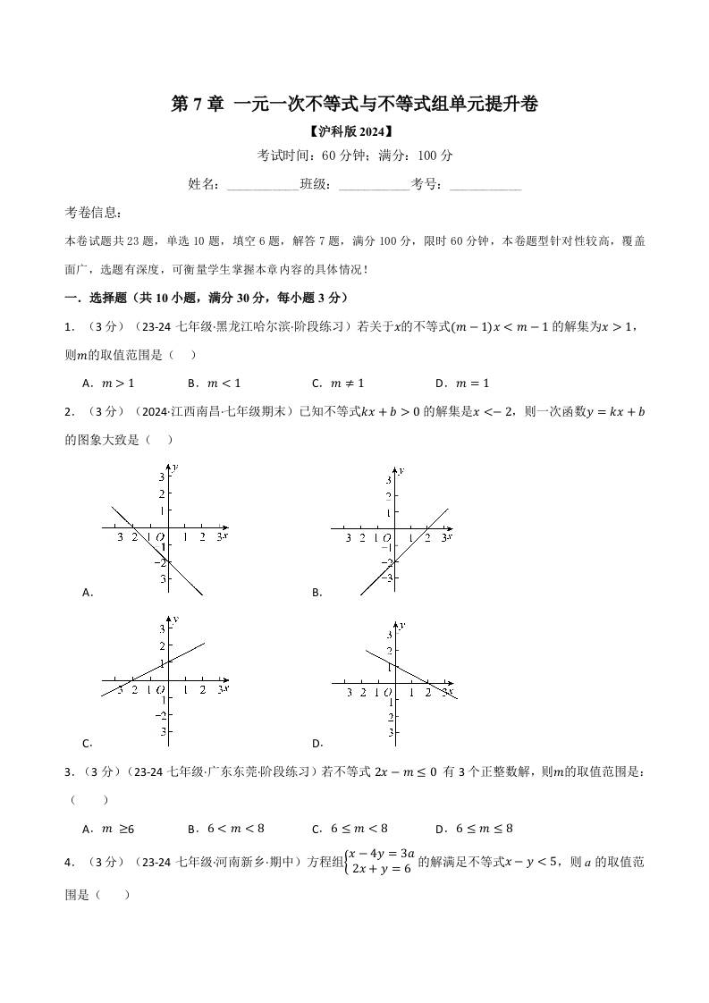 专题7.7 一元一次不等式与不等式组单元提升卷(沪科版2024)(原卷版)
