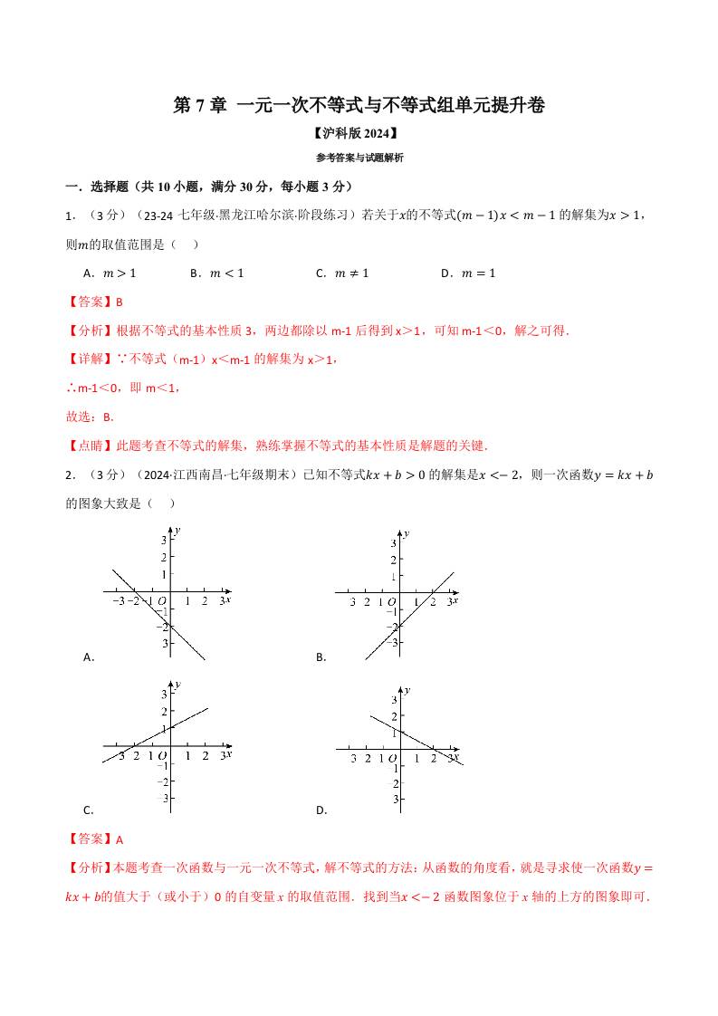 专题7.7 一元一次不等式与不等式组单元提升卷(沪科版2024)(解析版)