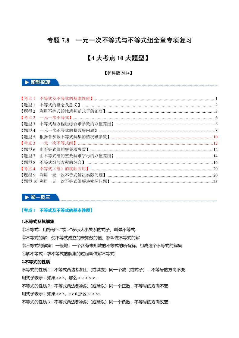 专题7.8 一元一次不等式与不等式组全章专项复习【4大考点10大题型】(举一反三)(沪科版2024)(原卷版)