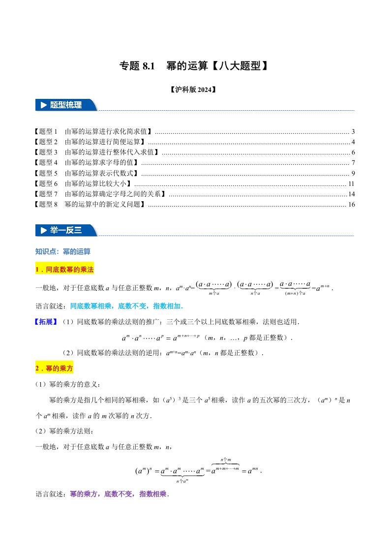 专题8.1 幂的运算【八大题型】(举一反三)(沪科版2024)(原卷版)