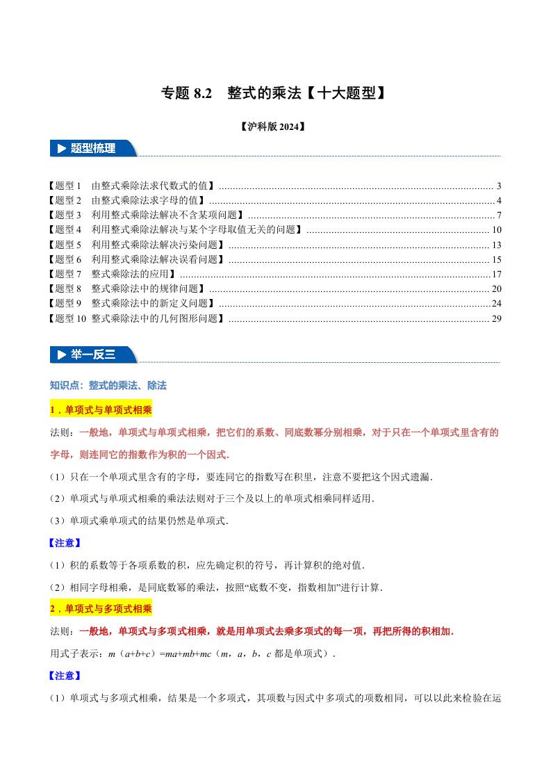 专题8.2 整式的乘法【十大题型】(举一反三)(沪科版2024)(原卷版)