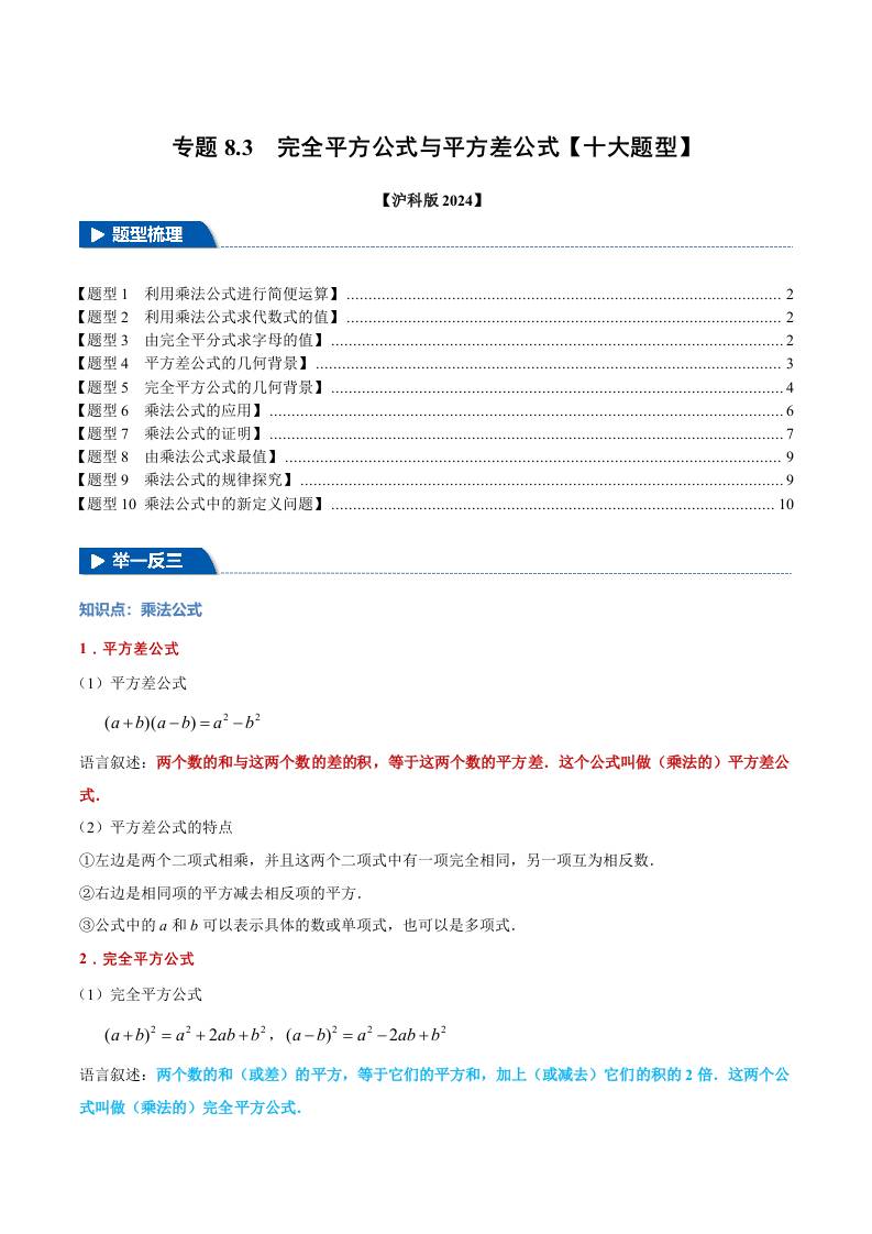 专题8.3 完全平方公式与平方差公式【十大题型】(举一反三)(沪科版2024)(原卷版)