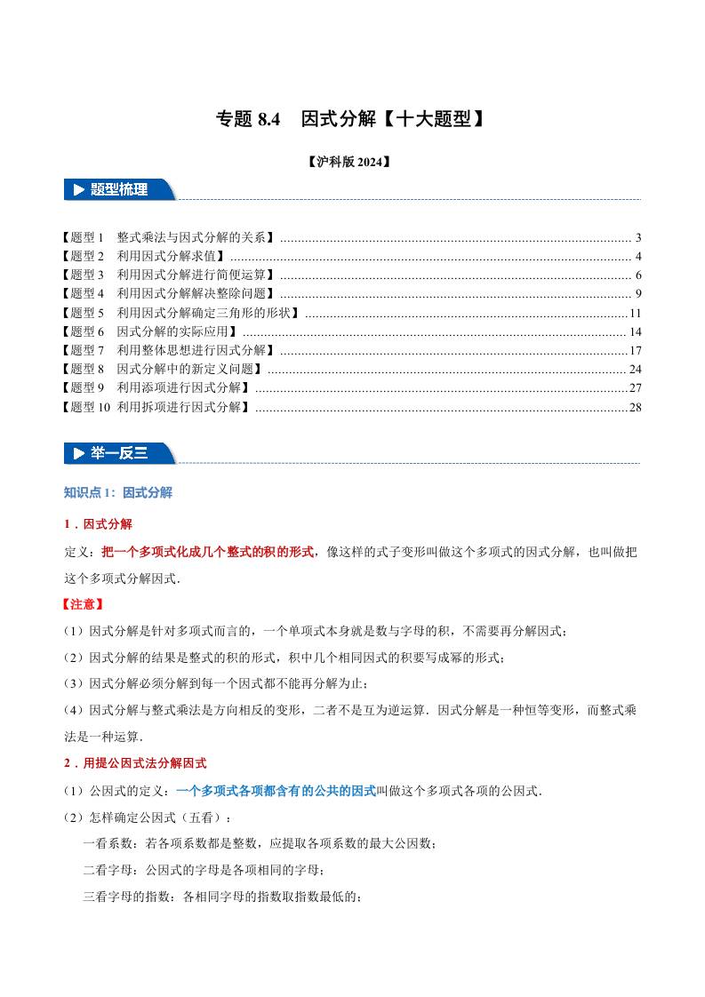 专题8.4 因式分解【十大题型】(举一反三)(沪科版2024)(原卷版)