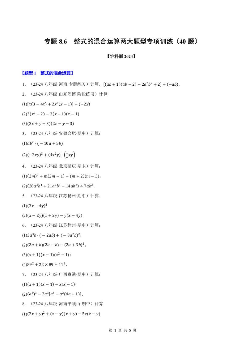 专题8.6 整式的混合运算两大题型专项训练(40题)(原卷版)